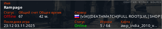 Играет на Counter Strike Source сервере. Страна: РоссияПервый раз замечен 17:31 31.08.2023