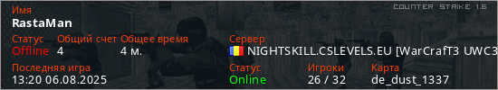 Последний раз был в сети 13:20 06.08.2025 Игрок с таким ником замечен на 3 серверах