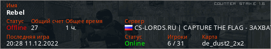 Играет на Counter Strike 1.6 сервере. Страна: РоссияПервый раз замечен 18:39 11.12.2020