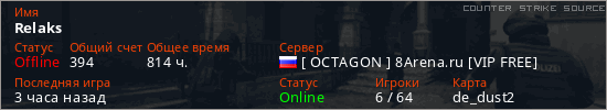 Играет на Counter Strike Source сервере. Страна: РоссияПервый раз замечен 04:29 08.08.2021