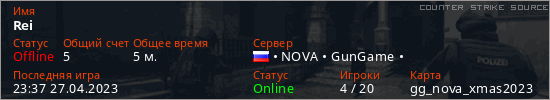 Играет на Counter Strike Source сервере. Страна: РоссияПервый раз замечен 23:35 27.04.2023