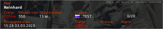 Играет на Call of Duty 4: Modern Warfare сервере. Страна: РоссияПервый раз замечен 14:38 03.03.2025