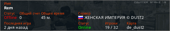 Играет на Counter Strike 1.6 сервере. Страна: РоссияПервый раз замечен 14:19 09.02.2026