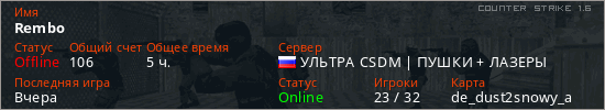 Играет на Counter Strike 1.6 сервере. Страна: РоссияПервый раз замечен 00:49 17.10.2024