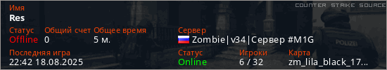 Играет на Counter Strike Source сервере. Страна: РоссияПервый раз замечен 22:30 18.08.2025