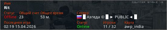 Играет на Counter Strike 1.6 сервере. Страна: РоссияПервый раз замечен 07:37 12.03.2026