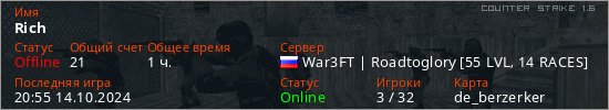 Играет на Counter Strike 1.6 сервере. Страна: РоссияПервый раз замечен 16:51 09.12.2022