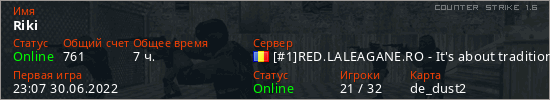 Играет на Counter Strike 1.6 сервере. Страна: РумынияПервый раз замечен 23:07 30.06.2022