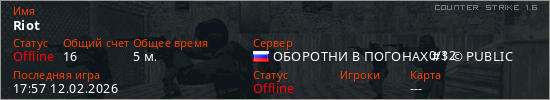 Играет на Counter Strike 1.6 сервере. Страна: РоссияПервый раз замечен 17:54 12.02.2026