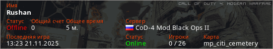 Играет на Call of Duty 4: Modern Warfare сервере. Страна: РоссияПервый раз замечен 13:21 21.11.2025