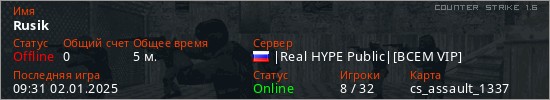 Играет на Counter Strike 1.6 сервере. Страна: РоссияПервый раз замечен 09:27 02.01.2025