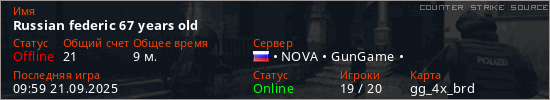 Играет на Counter Strike Source сервере. Страна: РоссияПервый раз замечен 09:43 21.09.2025