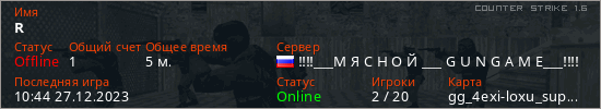 Играет на Counter Strike 1.6 сервере. Страна: РоссияПервый раз замечен 10:24 27.12.2023
