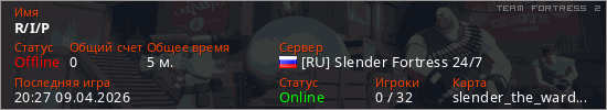 Играет на Team Fortress 2 сервере. Страна: РоссияПервый раз замечен 20:16 09.04.2026