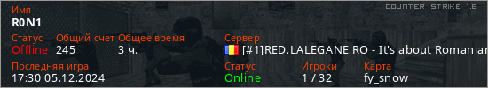 Играет на Counter Strike 1.6 сервере. Страна: РумынияПервый раз замечен 18:26 10.06.2022