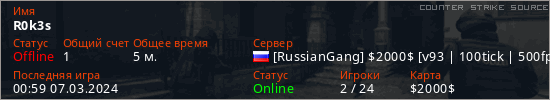 Играет на Counter Strike Source сервере. Страна: РоссияПервый раз замечен 00:55 07.03.2024