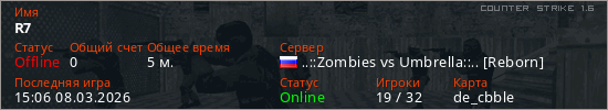 Играет на Counter Strike 1.6 сервере. Страна: РоссияПервый раз замечен 15:03 08.03.2026