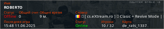 Играет на Counter Strike 1.6 сервере. Страна: РумынияПервый раз замечен 15:28 26.02.2025