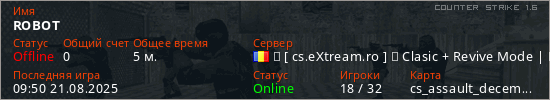 Играет на Counter Strike 1.6 сервере. Страна: РумынияПервый раз замечен 09:33 21.08.2025