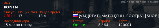 Играет на Counter Strike Source сервере. Страна: РоссияПервый раз замечен 10:36 16.03.2026