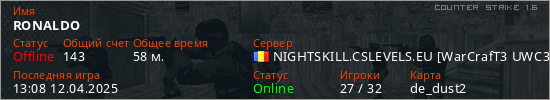 Играет на Counter Strike 1.6 сервере. Страна: РумынияПервый раз замечен 21:45 30.09.2024