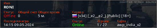 Играет на Counter Strike Source сервере. Страна: РоссияПервый раз замечен 14:13 09.05.2024