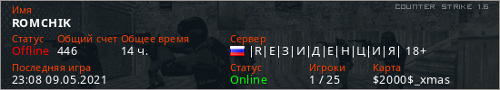 Играет на Counter Strike 1.6 сервере. Страна: РоссияПервый раз замечен 13:35 18.12.2019