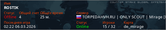 Играет на Counter Strike Global Offensive сервере. Страна: РоссияПервый раз замечен 21:28 05.03.2026