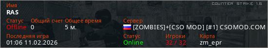 Играет на Counter Strike 1.6 сервере. Страна: РоссияПервый раз замечен 01:02 11.02.2026