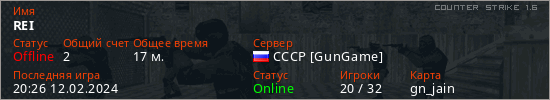 Играет на Counter Strike 1.6 сервере. Страна: РоссияПервый раз замечен 06:37 07.02.2024