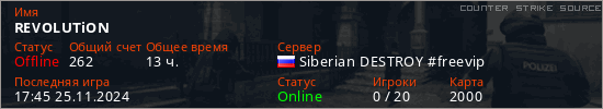 Играет на Counter Strike Source сервере. Страна: РоссияПервый раз замечен 22:27 27.01.2023