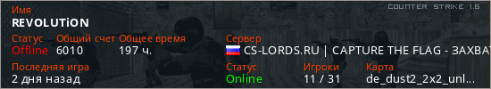 Играет на Counter Strike 1.6 сервере. Страна: РоссияПервый раз замечен 20:57 26.08.2020