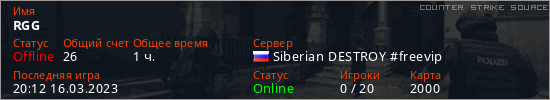 Играет на Counter Strike Source сервере. Страна: РоссияПервый раз замечен 22:13 07.03.2023