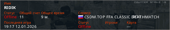 Играет на Counter Strike 1.6 сервере. Страна: РоссияПервый раз замечен 19:34 19.12.2025