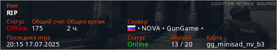 Играет на Counter Strike Source сервере. Страна: РоссияПервый раз замечен 09:22 29.06.2025