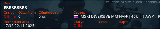 Играет на Counter Strike Global Offensive сервере. Страна: РоссияПервый раз замечен 17:26 22.11.2025