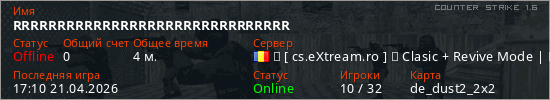 Играет на Counter Strike 1.6 сервере. Страна: РумынияПервый раз замечен 17:08 21.04.2026