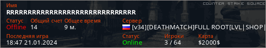 Играет на Counter Strike Source сервере. Страна: РоссияПервый раз замечен 02:15 06.01.2024