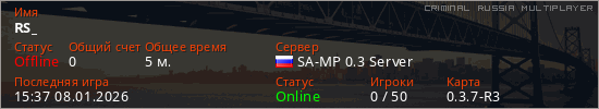 Последний раз был в сети 15:37 08.01.2026 Игрок с таким ником замечен на 6 серверах