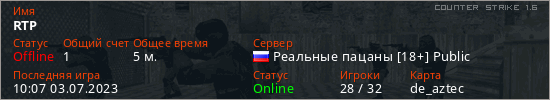 Играет на Counter Strike 1.6 сервере. Страна: РоссияПервый раз замечен 10:05 03.07.2023
