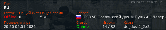 Играет на Counter Strike 1.6 сервере. Страна: РоссияПервый раз замечен 20:16 05.01.2026