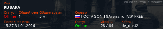 Играет на Counter Strike Source сервере. Страна: РоссияПервый раз замечен 15:25 31.01.2026