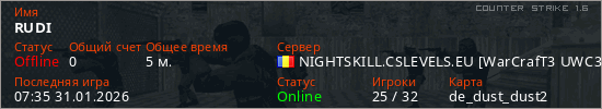 Играет на Counter Strike 1.6 сервере. Страна: РумынияПервый раз замечен 07:30 31.01.2026