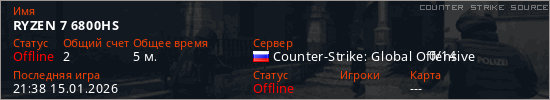 Играет на Counter Strike Source сервере. Страна: РоссияПервый раз замечен 20:09 15.01.2026