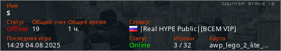 Играет на Counter Strike 1.6 сервере. Страна: РоссияПервый раз замечен 19:19 21.03.2024