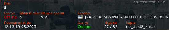 Играет на Counter Strike 1.6 сервере. Страна: СШАПервый раз замечен 12:11 19.08.2025