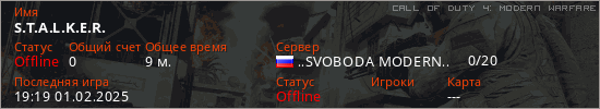 Играет на Call of Duty 4: Modern Warfare сервере. Страна: РоссияПервый раз замечен 13:00 12.01.2025