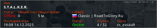 Играет на Counter Strike 1.6 сервере. Страна: РоссияПервый раз замечен 18:37 14.12.2025