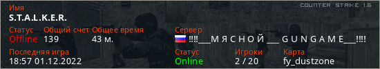 Играет на Counter Strike 1.6 сервере. Страна: РоссияПервый раз замечен 18:16 01.12.2022