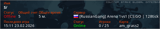Играет на Counter Strike Global Offensive сервере. Страна: РоссияПервый раз замечен 14:30 23.02.2026
